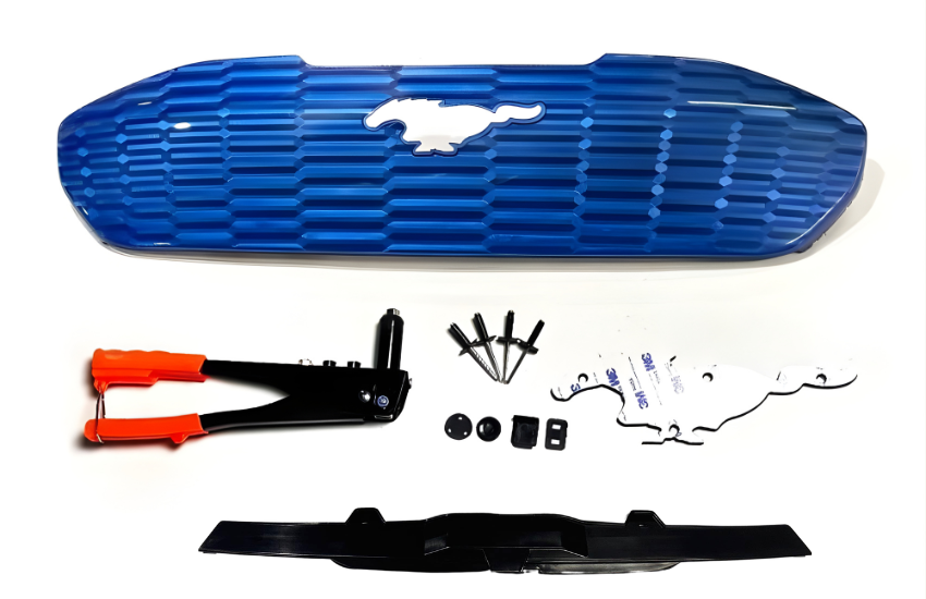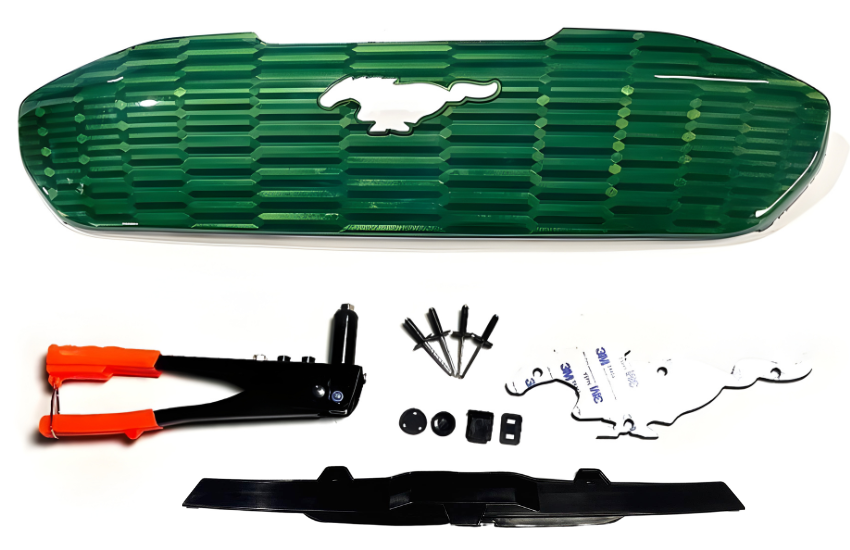 • Kit includes: camera trim, 3D grille, 3M foam for the pony flush with the grille, rivets, rivet gun, and camera and washer caps (if your car doesn’t already have them).